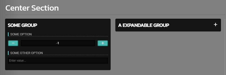 Supports expandable sections, number inputs with increment/decrement handlers, and custom action buttons.